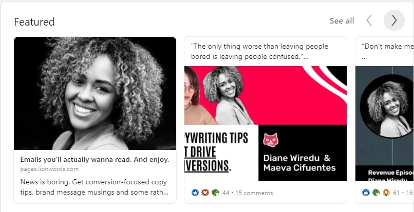 考虑使用可查找的关键字。想想你的目标客户在搜索你的服务时使用的词。然后,随着您持续发布,您将毫不费力地出现在您的关键字的 LinkedIn 结果中。这是Lily Ugbaja的另一个例子。