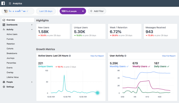 您可以在此收集到关于企业和客户的大量信息,包括活跃用户、购买、销售渠道等。报表是任何分析软件的基础,所以Facebook运营拥有广泛的报表能力并不奇怪。在指示板中,可以生成包含几乎所有活动或事件信息的报告。