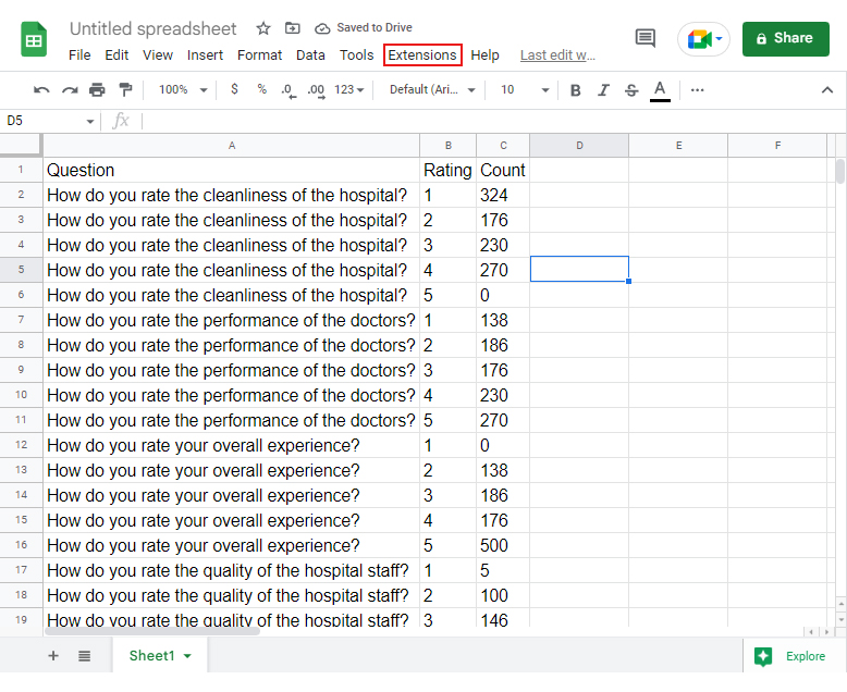Google 表格是用于可视化数据的免费工具之一。这个电子表格应用程序具有简单友好的用户界面。所以它是大多数人的首选可视化工具。