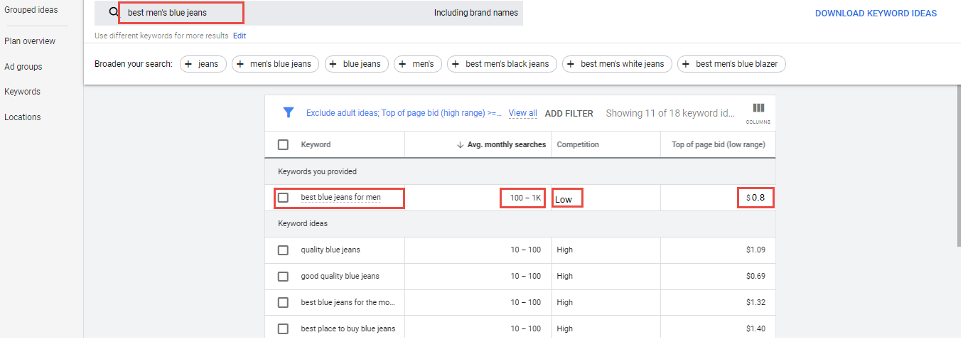 例如,在我们之前的示例中——女士蓝色牛仔裤和男士蓝色牛仔裤——竞争激烈,这意味着我们会支付更多费用,并且发现很难使用这些术语进行排名。