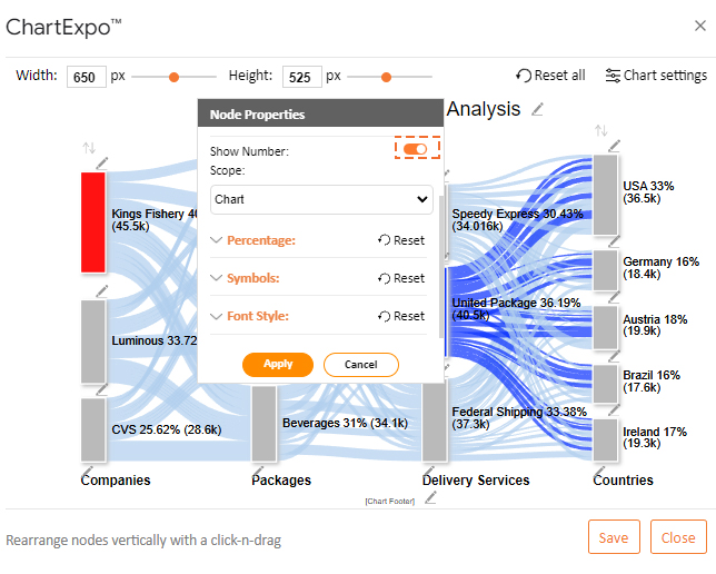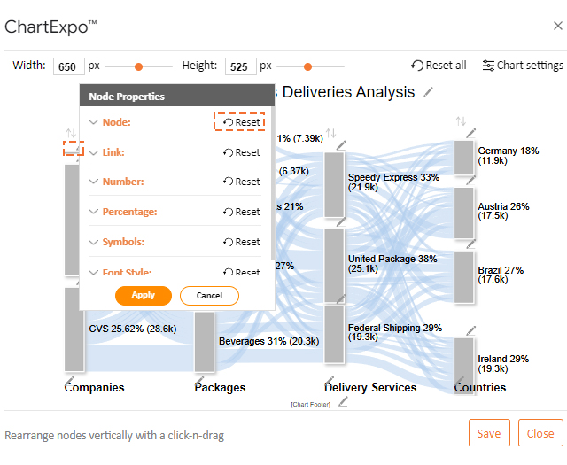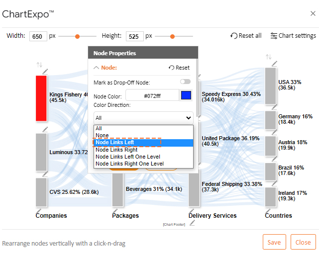 如果选择 By metric (Deliveries) ASC 它将根据 Deliveries 的值按升序排列节点,By metric (Deliveries) DESC 它将根据 Deliveries 的值按降序排列节点,按链接数 ASC 将对节点进行升序排序根据每个节点具有的链接数排序,并按链接数 DESC 将根据每个节点具有的链接数降序对节点进行排序。让我们选择 By metric (Deliveries) DESC。