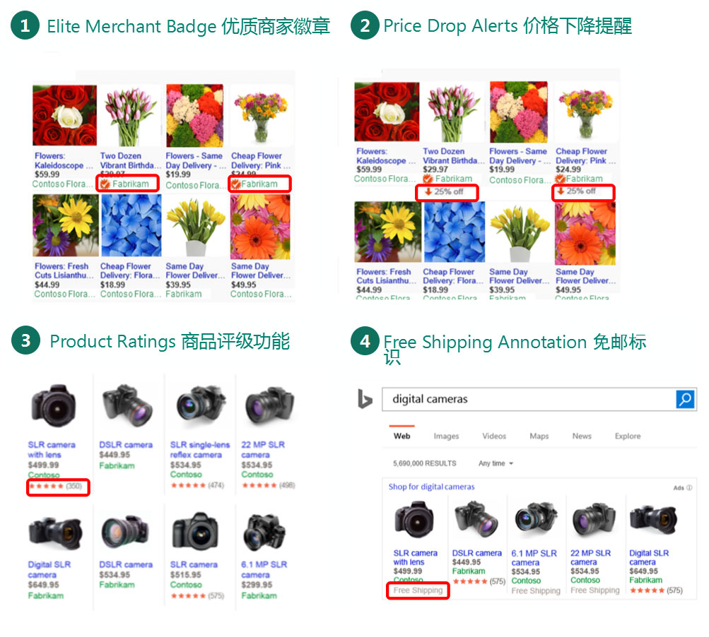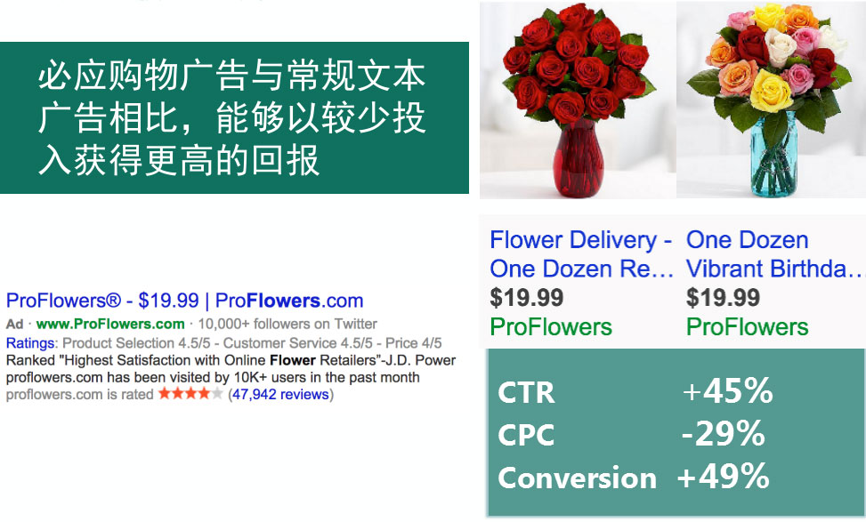 Google Ads Google搜索广告 Google展示广告 Google再营销 Gmail广告(GSP) Google购物广告 Bing Ads Bing出口通 Bing再营销 Bing动态搜索广告 Bing购物广告 Bing应用安装广告 Yandex广告 Yandex简介 Yandex.Direct 广告 Yandex.Display横幅广告 Yandex.Market商城 Google Ads Google搜索广告 Google展示广告 Google再营销 Gmail广告(GSP) Google购物广告 Bing Ads Bing出口通 Bing再营销 Bing动态搜索广告 Bing购物广告 Bing应用安装广告 Yandex广告 Yandex简介 Yandex.Direct 广告 Yandex.Display横幅广告 Yandex.Market商城 为什么选择必应购物广告? 必应购物广告 | Bing Product Ads 必应购物广告包含产品图片、价格及商家信息等,直观吸引客户的注意办,获得更高的点击率。当用户的搜索字词触发必应购物广告时,广告将展示在右侧的位置(如左图)(还有部分广告会展示在左侧,目前是在测试中)。目前购物广告开放的国家有US, UK, AU, CA,FR, DE, 这其中包括了欧洲地区的法国和德国,目前必应购物广告只能投放英文广告。印度市场必应广告正在测试当中。 以较少投入获得更高回报 对于零售行业,为什么要重点推购物广告呢,相比文本广告 ,必应购物广告能够以较少的投入获得更高的回报,效果数据也非常理想。就目前已经投放必应购物广告客户较多并且效果很好的,集中在女装,珠宝,3C,假发,家居等行业。 使用 Merchant Promotion 功能显示商品的特定促销信息 Bing动态搜索广告最佳实践 使用 Ads decorations 功能提高广告交互性 购物广告为零售行业不断带来新体验 必应购物广告也在不断扩展流量或者增加新的功能,为客户提供必应购物广告的搜索新体验。目前已经更新在pilot的产品:local inventory ads(本地库存广告)、Flyers Extension and Carousel(彩页传单)像使用shopping tab,以及在bing snapshots(必应快照)中和image search(图片搜索)中的必应购物广告,都在为零售行业的客户不断带来新的体验。也新发布了必应购物广告开放的国家加拿大和印度。希望能够有更多的客户了解并使用必应购物广告,同时达到对于效果的预期要求。