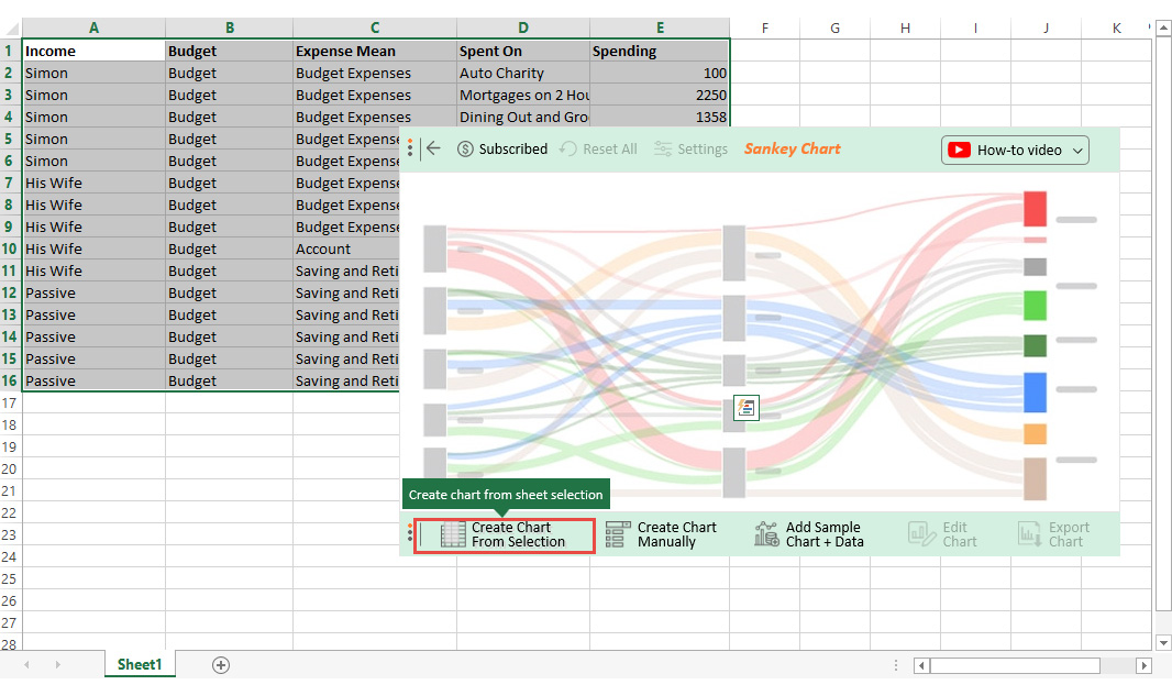 - 您可以将上表复制到 Excel 工作表中,然后从 ChartExpo 插件中找到 Sankey Chart。