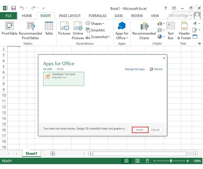 - 选择 ChartExpo 加载项并单击插入按钮。