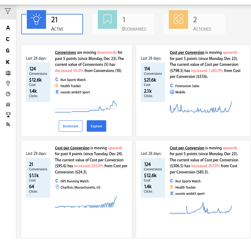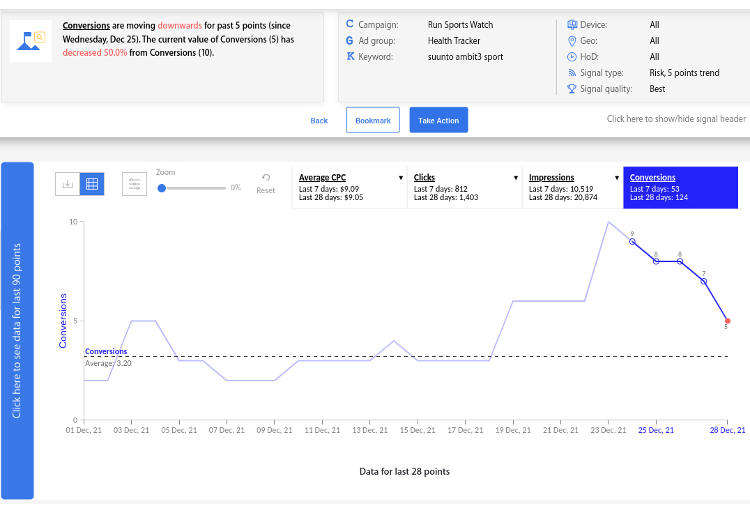 系统将当前指标性能与过去时期进行比较,并查找模式、偏差或异常情况。当它检测到其中一个事件时,它会分析数据,将其打包并呈现在您的 PPC Signal 仪表板上。